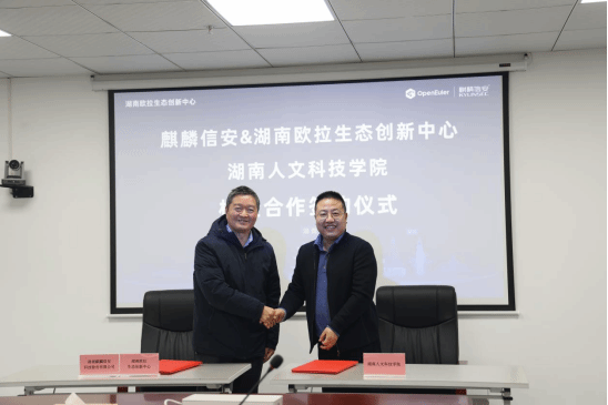 11月6日,今年会与麒麟信安、湖南欧拉生态创新中心校企深度合作协议签约仪式举行,麒麟信安总裁刘文清、今年会信息学院院长刘浩代表双方签署协议,麒麟信安副总裁刘少龙、今年会信息学院副院长王剑波、彭智朝、计科教研室主任李伟民等领导出席签约仪式。