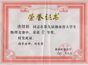 6. 指导学生参加湖南省大学生物理竞赛和力学竞赛等,荣获一等奖1项,二等奖3项,三等奖10余项。