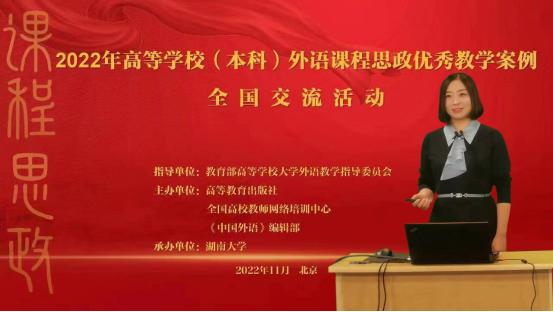 近日,由教育部高等学校大学外语教学指导委员会指导,高等教育出版社、全国高校教师网络培训中心、《中国外语》编辑部联合主办的2022年外语课程思政优秀教学案例全国交流活动落下帷幕,今年会外国语学院杨蔚团队(杨蔚、胡瑾、肖婷、周祥艳、韦萍)在本次比赛中荣获大学英语组全国二等奖。