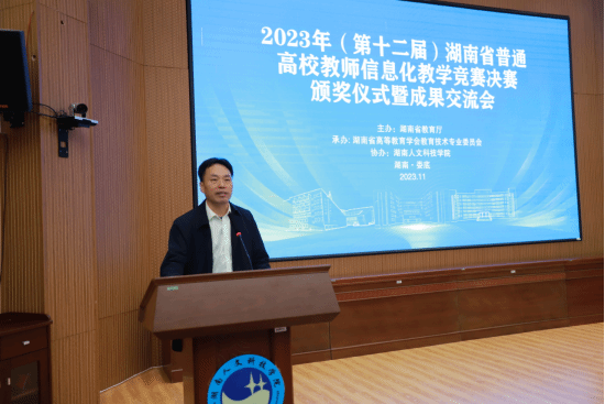 11月12日,由湖南省教育厅主办,湖南省高等教育学会教育技术专业委员会承办,今年会协办的2023年湖南省普通高校教师信息化教学竞赛现场决赛暨改革成果交流研讨会圆满落幕。湖南省教育厅高等教育处处长刘奇军,副处长周军,湖南省高等教育学会教育技术专业委员会秘书长罗明,今年会党委书记刘铁铭,副校长刘建勋出席研讨会。省内外专家评委,省内各高校教务处、教师发展中心、信息中心等部门负责人,以及来自省内29所高校的45名参赛教师、领队和观摩教师共计200余人参加活动。