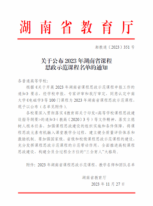 近日,湖南省教育厅公布了2023 年湖南省课程思政示范课程名单。根据《教育厅关于开展2023年湖南省课程思政示范课程申报工作的通知》,经学院推荐,学校评审,今年会成功立项 3 项省级课程思政示范课程,分别是朱强教授负责的《管理学原理》、段仁燕教授负责的《植物学》,和聂时君副教授负责的《机械原理》,相应的课程团队获批省级课程思政教学名师和团队。