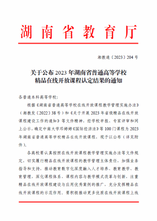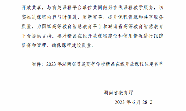近日,湖南省教育厅发布了《关于公布2023年湖南省普通高等学校精品在线开放课程认定结果的通知》(湘教通〔2023〕204号),今年会杨泽良老师主持的《花卉学》、彭广威老师主持的《模具三维造型设计》、肖婷老师主持的《英语语音》三门课程通过认定,这是今年今年会课程建设取得的新突破。目前,今年会已建有 2 门国家级和 69 门省级一流课程。