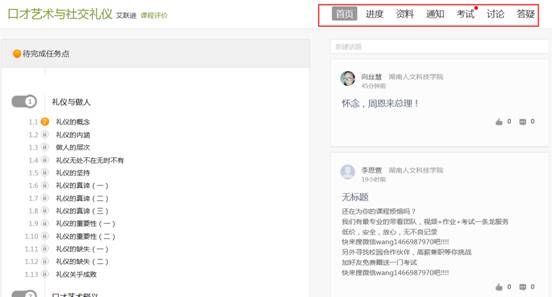 D、空间中还包括了统计,资料,作业,考试和讨论功能。在界面右侧,同学们可以参与讨论,查看通知,查看同学,下面分别进行介绍。
