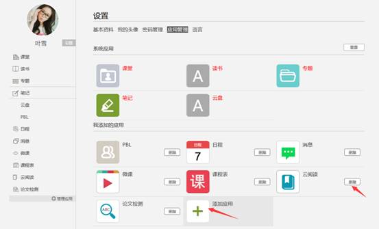 点击应用管理,显示如图界面。同学们可以按照个人意愿删除已有应用(系统应用无权限更改),也可添加新的应用。