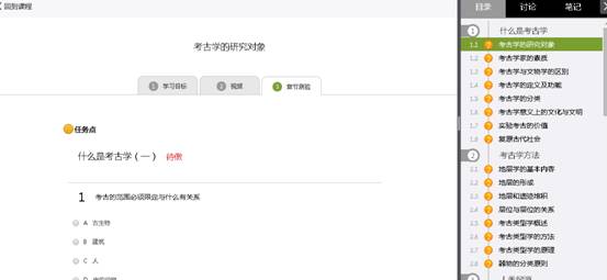 B、进入课程学习后,学习页面如下图所示。主要是课程内容,右侧是章节目录,其中进度点显示为橙色并带有数字提示,表示还有相应的任务点未完成,完成则显示为绿色。