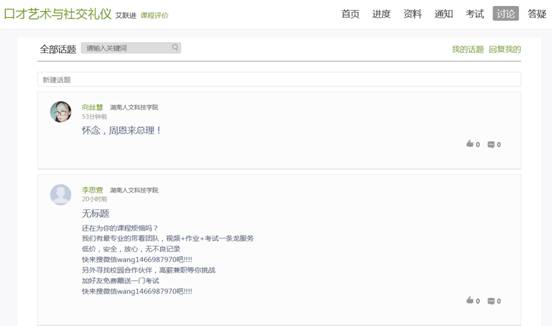 在课程空间的导航栏中点击讨论,即可进入讨论界面,学生可以在任何章节新建讨论话题,也可以在已有话题中点击回复参与讨论,老师可以对学生谈论内容加精处理,加精后的讨论显示为精华,以便学生筛选查看。除此之外,还有问答,我发表的和我回复的三个筛选条件。