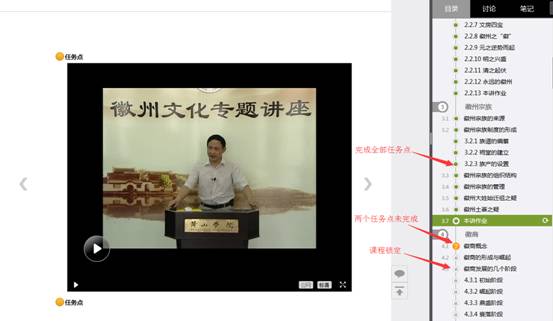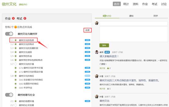 A、以徽州文化为例,点击章节知识点名称,即可进行课程学习,可以按照自己的学习进度进行课程的学习。学习进度在课程目录右侧显示。