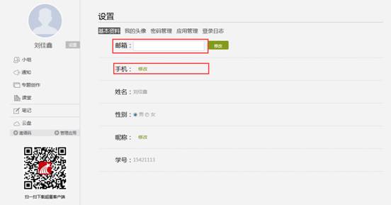 基本资料设置,同学们通过本页设置可以实现绑定邮箱、填写手机号的功能。