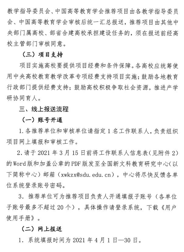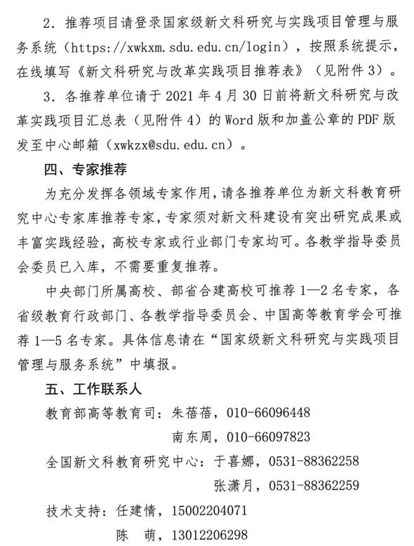 由我厅推荐的申报国家级新文科研究与改革实践项目(具体名单待我厅组织专家评审后再另行通知)以及新文科教育研究中心专家库的专家,须于4月26日前在“国家级新文科研究与改革实践项目管理与服务系统”(https://xwkxm.sdu.edu.cn/login)完成线上填报工作。