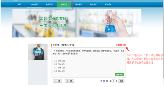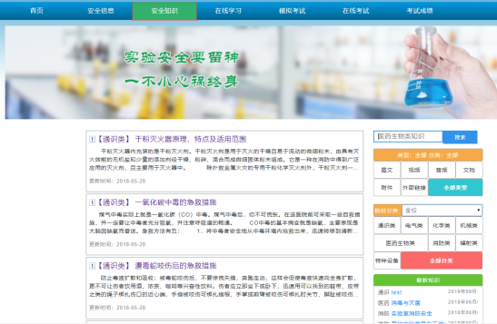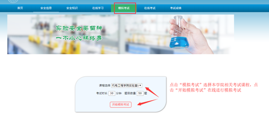1、请同学们在规定的时间内登录系统在“安全知识”中选取相应模块进行线上学习、在线模拟考试合格后再进入到考试系统考试,只有安全知识考核达标的学生才允许进入实验室进行实验。