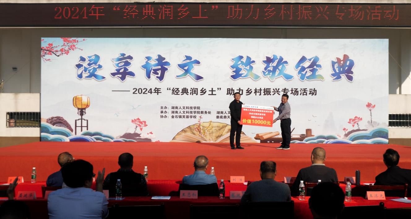 刘铁峰表示,本场诵读活动搭建的是一个书香墨韵的舞台,它不仅是一次知识的传递,更是在乡村孩子的心中播下了经典文化的种子。这颗种子将在乡村振兴的沃土里生根发芽,为乡村文化的繁荣发展注入源源不断的动力,助力乡村向着更具文化底蕴的方向大步迈进。也希望大家能在此次活动中尽情品味语言文字的魅力,体会传统文化的精深,不断为弘扬传统文化、助力乡村振兴贡献力量,并带领教务处党支部成员向金石镇芙蓉学校赠送了办公用品。