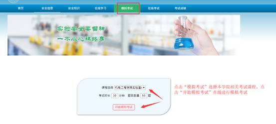 4、考试次数及达标分数。本次安全考试系统设定的每个学生可考试次数为3次,达标分数为85分。请同学们在规定的时间内登录系统在“安全知识”中选取相应模块进行线上学习、在线模拟考试合格后再进入到考试系统考试,只有安全知识考核达标的学生才允许进入实验室进行实验。