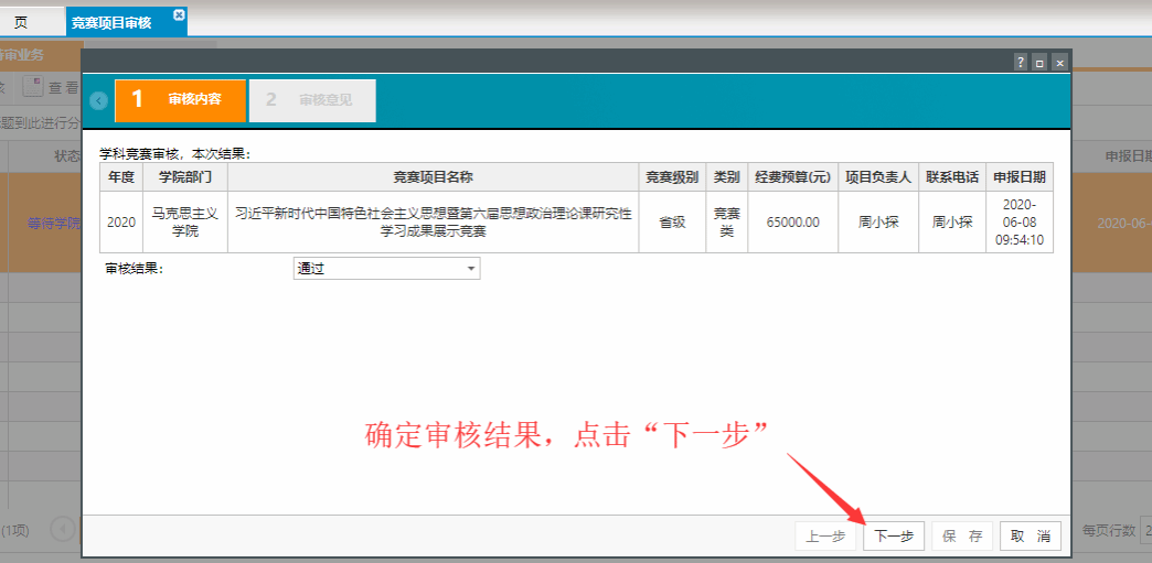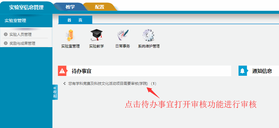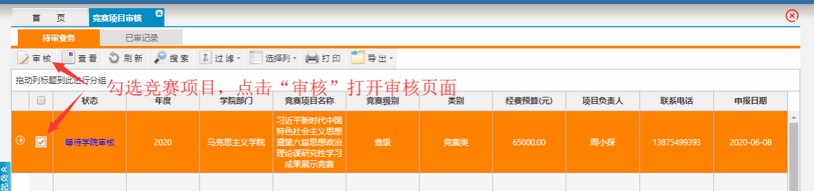 登录系统后,如有需要审核的申报竞赛项目,系统会推送待办事宜,直接点击待办事宜即可打开审核功能进行审核