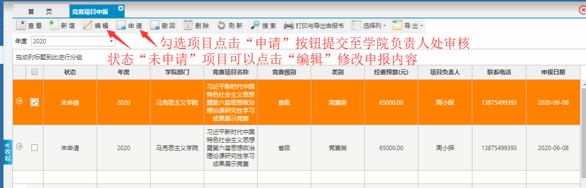ü状态为“等待学院”的竞赛项目,需要进行调整,可以选中数据点击“撤回”进行编辑修改。(如图)