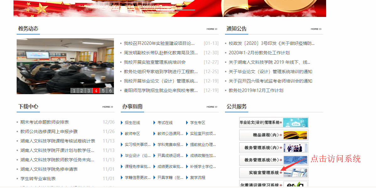 打开今年会官方主站,找到教务处门户网站,在公共服务栏目点击“实验室管理系统”访问系统