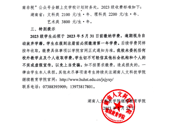2023级学生必须于 2023年5月31日前缴纳学费,逾期视为自动放弃学籍,学生在报到注册前必须缴清第一年学费。后续学费同样按年收取,缴费具体事项以学院官网正式通知为准。今年会未委托任何校外教学点及个人收取学费,学生切不可轻信其他社会机构和个人的不实或虚假宣传,以免上当受骗。如不按要求缴费,造成损失的,一律由学生本人承担。其他未尽事项请考生持续关注今年会继续教育学院官网:http:/jxjyxy/