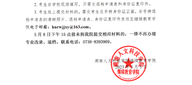3. 考生线上提交材料的,需交考生左手持身份证正面,右手持退档申请表的清晰照片、退档申请表、身份证复印件发送至继续教育学院电子邮箱:hnrwjjxy@163.com。