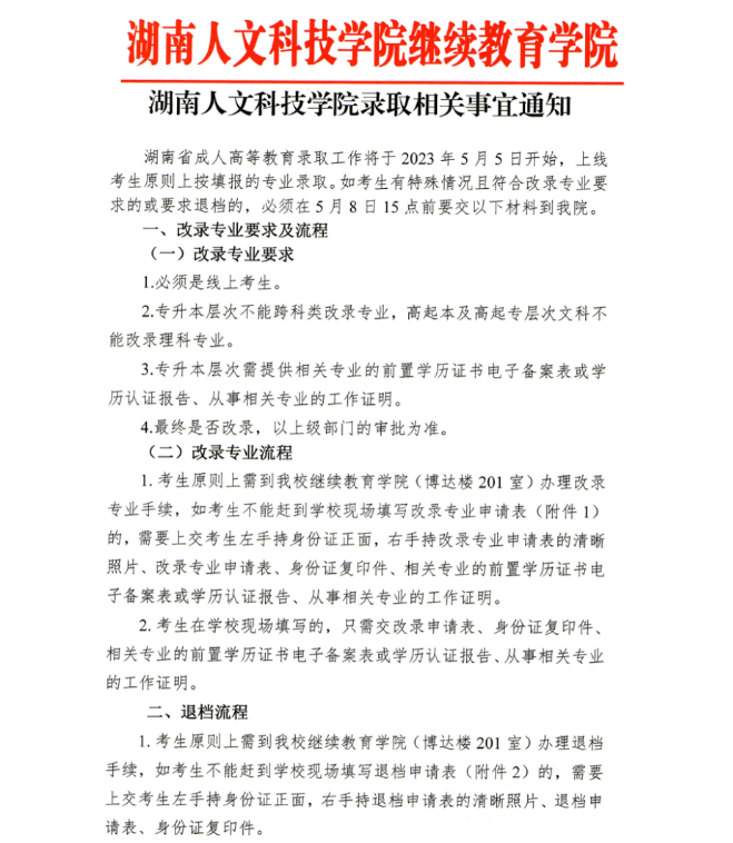 湖南省成人高等教育录取工作将于2023年5月5日开始,上线考生原则上按填报的专业录取。如考生有特殊情况且符合改录专业要求的或要求退档的,必须在5月8日15点前要交以下材料到我院。