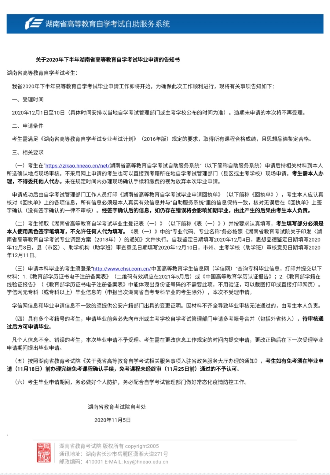 上一条:关于做好今年会自考毕业生照片及个人信息比对确认工作的通知 下一条:湖南省教育考试院关于我省高等教育自学考试免考、转籍、毕业证明书、毕业生登记表证明办理审核等事项的公告