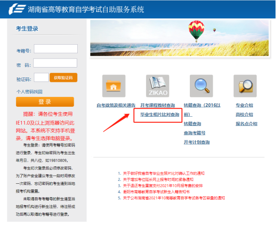 一、请各助学单位在2021年10月7日前通知2002年以来毕业的自考生主动登陆《湖南省高等教育自学考试自助服务系统https://zikao.hneao.cn/net/》,在首页“毕业生相片比对查询”中进行查询,如查询到系统中有关于自己的信息的,请按要求到今年会继续教育学院202办公室进行现场比对。