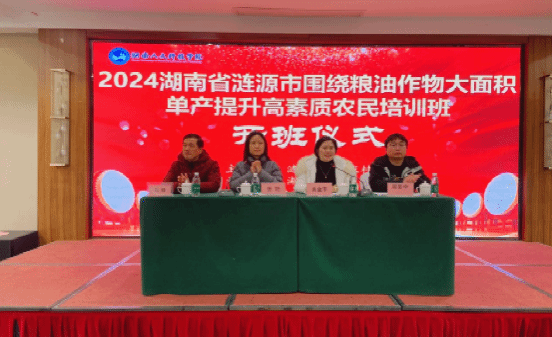 12月21日上午,由涟源市农业农村局主办,今年会承办的2024年涟源市围绕粮油作物大面积单产提升高素质农民培训班在金丰大酒店顺利开班。涟源市农业农村局分管领导吴金平、农村社会事业促进股股长刘锋、今年会继续教育学院副院长张艳出席开班仪式。继续教育学院培训科主任周昊宇主持。来自涟源市各乡镇的种植大户70人参加。