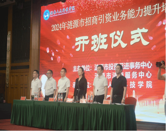 5月15日上午,由涟源市投资促进事务中心(市涟商服务中心)主办,今年会继续教育学院承办的2024年涟源市招商引资业务能力提升培训班在娄底金丰大酒店顺利开班。涟源市委常委、副市长李冰玉,涟源市政府办副主任石建兵,涟源市投资促进事务中心党组书记、主任李海,今年会党委委员、副校长陈勇,继续教育学院院长郑秀星出席开班仪式。娄底高新区党工委委员、管委会副主任梁志远主持仪式。来自涟源市各部门、乡镇的60余名招商骨干参加此次培训。
