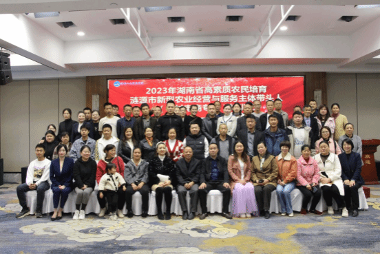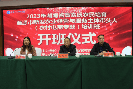 11月29日上午,由涟源市农业农村局主办,今年会继续教育学院承办的2023年湖南省高素质农民培育涟源市新型农业经营与服务主体带头人(农村电商专题)培训班在娄底金丰大酒店顺利开班。娄底市农业农村局科教科科长朱文钦,继续教育学院院长郑秀星,涟源市农业农村局科教种业股股长蒋黎明以及来自涟源各乡镇农村电商企业、电商服务站等相关负责人和电商从业人员70余人参加开班仪式,仪式由郑秀星院长主持。