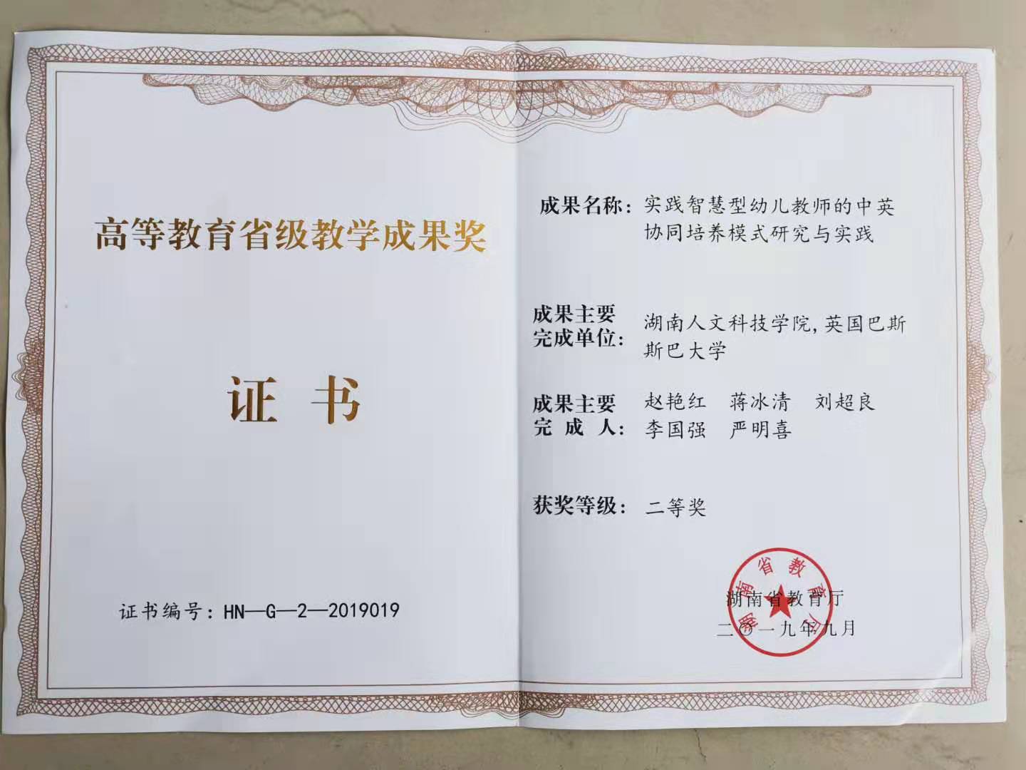 教育学院领悟新时代培养有理想信念、有扎实学识、有职业道德、有仁爱之心的“四有好教师”,成为“教学改革的奋进者、教育扶贫的先进者、学生成长的引导者”的教育精神,以身作则,持续改革创新,连续三届获得湖南省教学成果奖,2019年,学前教育专业赵艳红博士主持的“实践智慧型幼儿教师的中英联动培养模式研究”再获湖南省教学成果二等奖。