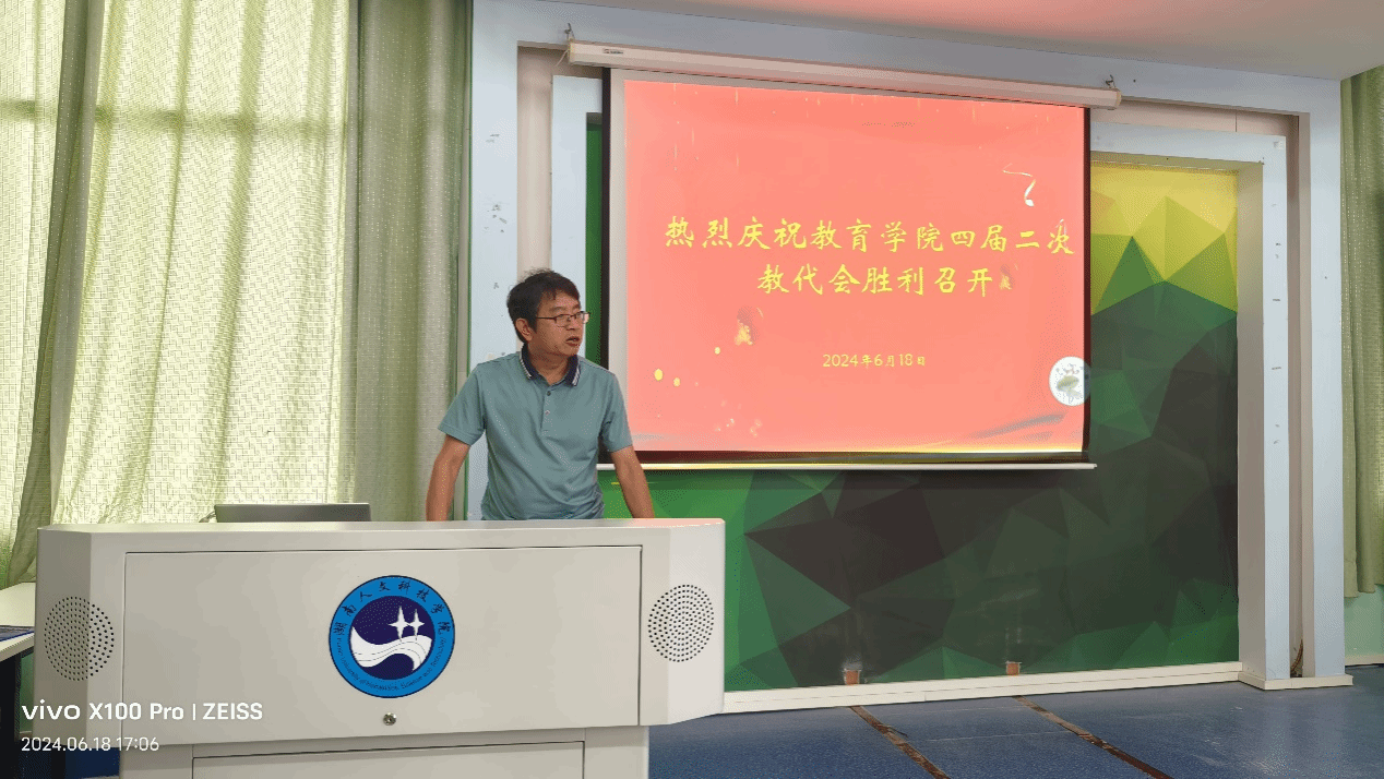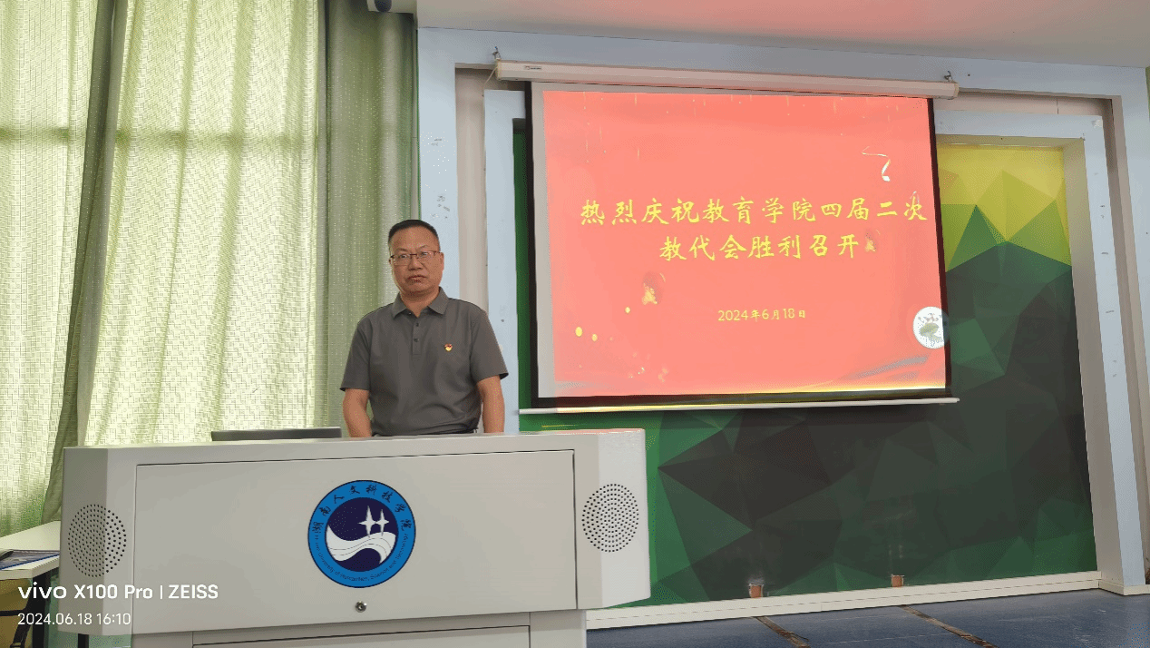 6月18日下午,教育学院在甘澍楼601召开“四届二次”教代会。会议由党总支书记陈功平主持,党总支副书记、院长蒋冰清、党总支副书记周卫军、副院长李国强,全体教职工、工会会员参加会议。