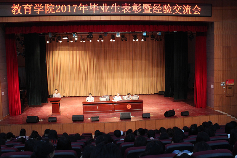 2017年5月14日晚,我院在逸夫楼音乐厅隆重举行2017届毕业生表彰暨经验交流会。我院申忠明书记、刘超良院长、徐建东副书记、李国强副院长及部分老师代表出席了此次会议。教育学院全体学生参加。会议由申忠明书记主持。