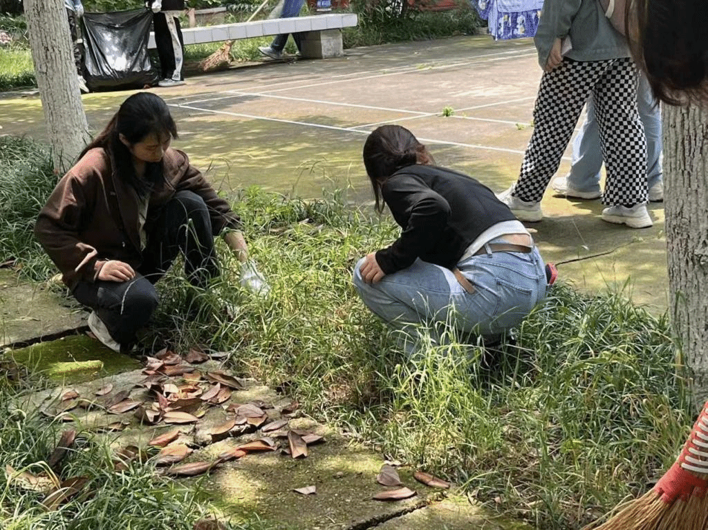 为了共建美丽校园,同学们手握工具分散至花坛、草地等各处进行清扫。有的同学戴着手套,弯腰捡起地上的白色垃圾和烟蒂,不遗漏任何一处地方;有的同学拿着扫把和撮箕,清扫过道上的落叶。经过同学们的辛勤劳动,校园一隅脱旧装换新衣,被覆盖着的绿草逐渐露出。