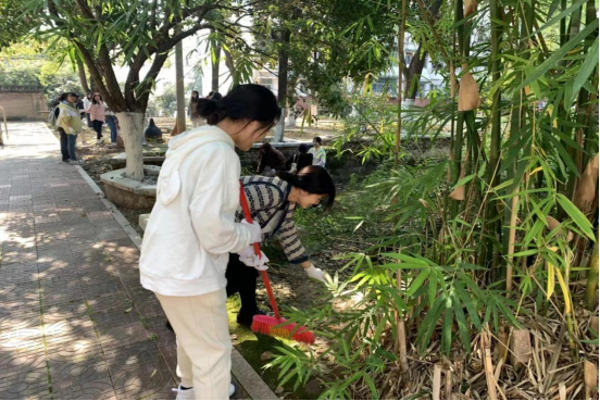 12月5日中午,教育学院23级全体同学在雅韵楼前开展第五次“守望花田”活动。同学们领取劳动工具后,有序前往事先划分的卫生区域进行了打扫。