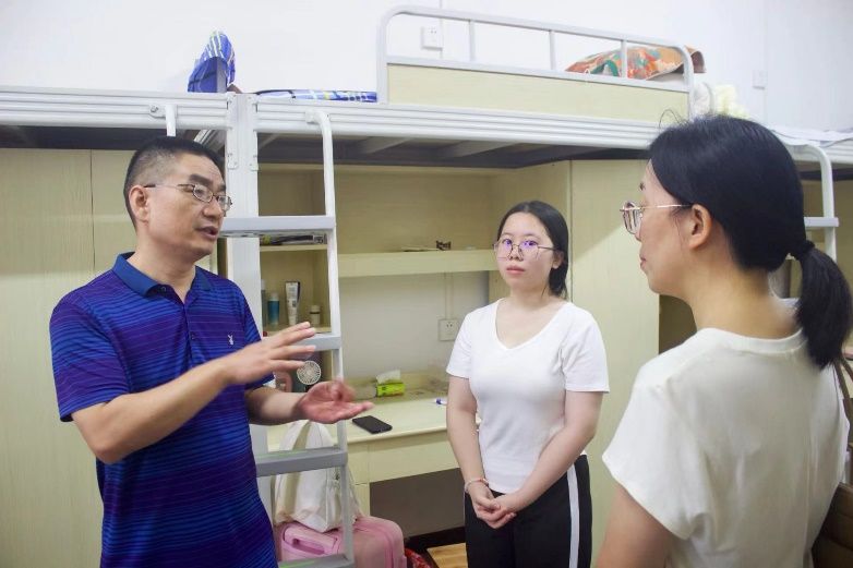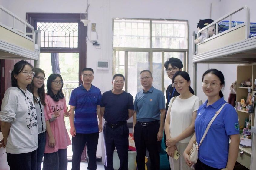 为深入了解新生入学后的生活适应情况,传递学院关怀与温暖,9月14日上午,我院党总支书记陈功平、院长蒋冰清、党总支副书记周卫军、应用心理学2403班班主任杨红君、辅导员罗斯琪、肖阳,深入新生宿舍,与新生们尤其是特殊群体学生进行面对面交流。