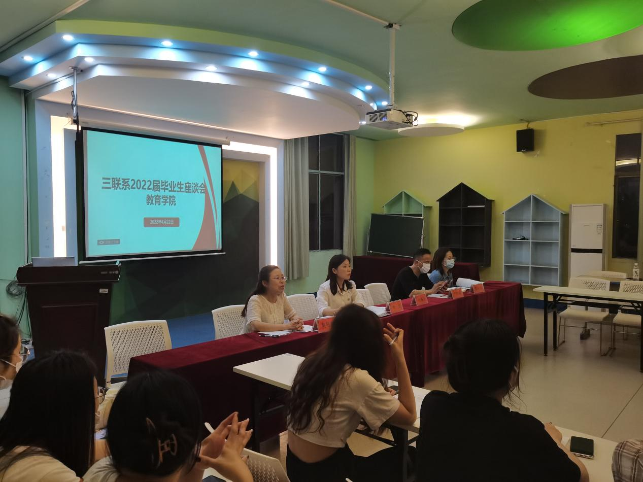 4月27日晚上,学校党委委员、副校长陈志国与学工处、继续教育学院等部门领导在教育学院开展“三联系”2022届毕业生座谈会,指导毕业生就业创业工作,了解学生学习、生活、工作上困难,帮助学生解决急难愁盼问题。学院全体领导、教研室主任、毕业班班主任、辅导员和2018级在校全体毕业生150余人,按“应心、学前(学合)、人教”专业分为三个会场座谈交流,党总支书记邹坤、副书记田密、副院长曹俊军分别主持,学校优秀校友、易禾公司董事长易胜其应邀参加。