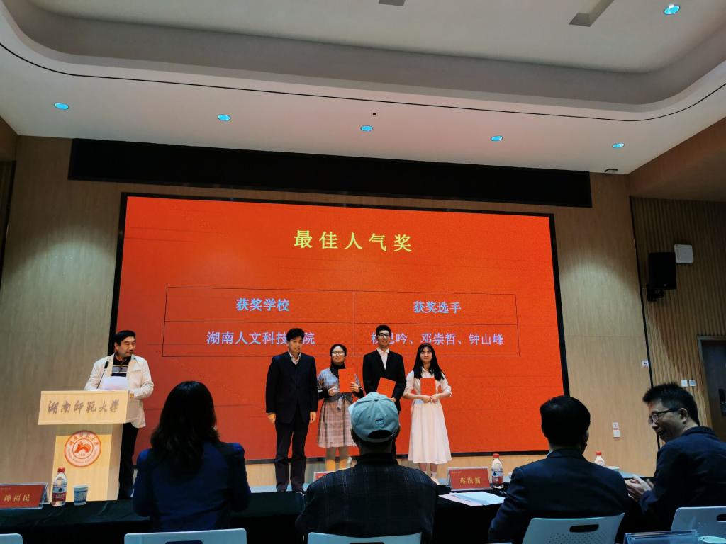 11月20日至22日,第三届“外教社杯”湖南省高校学生跨文化能力大赛在湖南师范大学举行。本次大赛共有来自全省的43所高校队伍参加,共有10支队伍晋级决赛。其中,代表今年会参赛的杨思吟(外国语学院)、邓崇哲(教育学院)、钟山峰(商学院)三名选手,经过激烈角逐,取得本科一组团队一等奖的好成绩。今年会代表队同时荣获“最佳人气奖”。