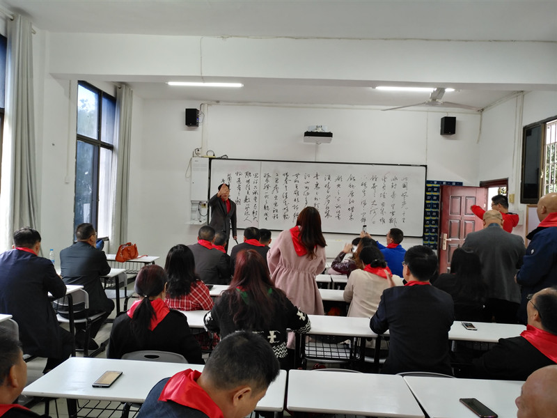 师生们统一着佩戴红领巾,坐在甘澍楼306教室里互诉衷肠,宛若回到了青春年少时。班主任周兰桂老师又“开讲”了,他在黑板上写下优美的板书。座谈会后,班主任和校友们参观了校园,并合影留念。