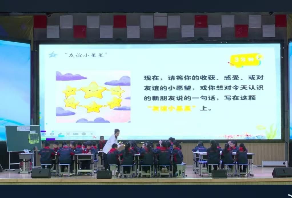 课堂上,刘迎香设计了“友谊小星星”互动环节——大屏幕上,可爱的星星图案搭配温馨指引:“请将收获、感受,或对友谊的小愿望、想对新朋友说的话,写在这颗‘友谊小星星’上”。在她的引导下,孩子们拿起纸笔,将对友谊的期待与心意凝注在星星卡片上,现场氛围温暖而热烈。