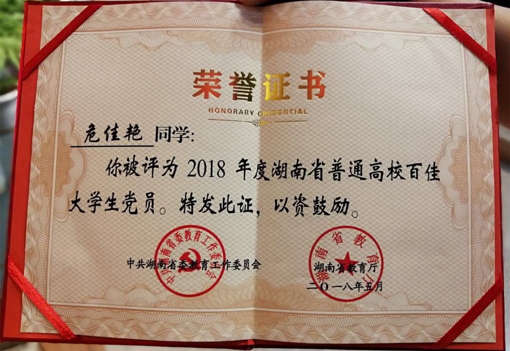 其中,“湖南省普通高校百佳大学生党员”是我院学生党员第一次获此殊荣。学校在十四个学院中开展了相关评选工作,最后推荐了我院危佳艳同学参加湖南省评选并获得了此项殊荣。危佳艳同学在校期间,思想积极上进,学习成绩优秀,综合素质全面,是今年会学生党员的优秀代表。