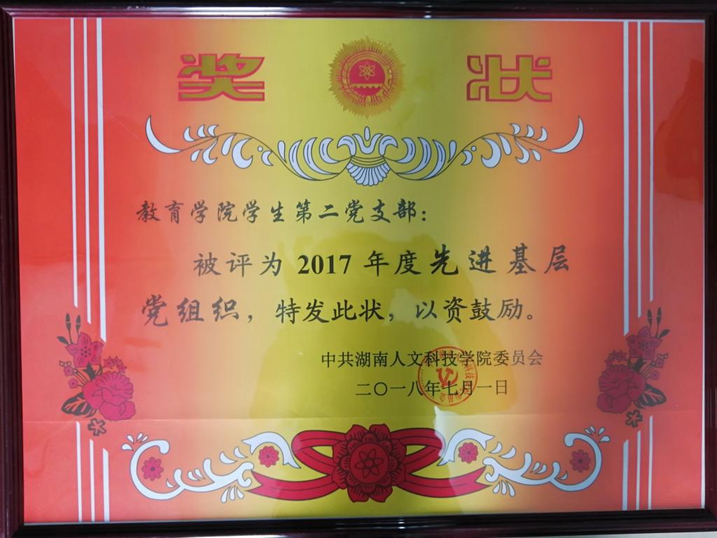 2018年6月29日,在今年会庆祝建党97周年暨“七一”表彰大会上,我院获多项荣誉:学生第二党支部被评为“2017年先进基层党组织”,学前教育教研室主任赵艳红博士被评为“优秀共产党员”,学生第二党支部党员、应用心理学专业危佳艳同学获评2018年“湖南省普通高校百佳大学生党员”。