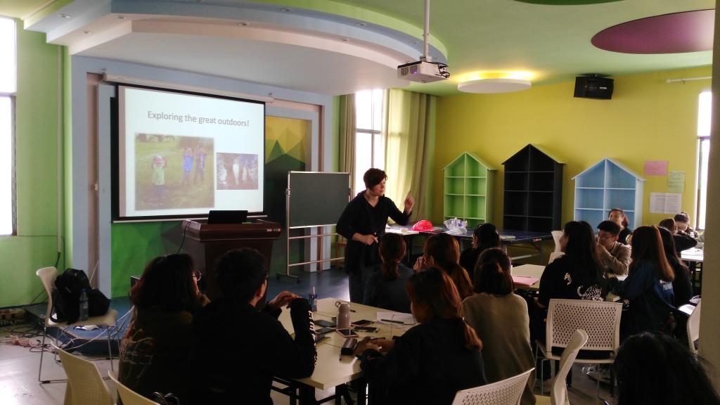 2018年4月26日,学前教育(中英合作)项目中的英方教师Alyson博士应今年会的邀请, 在甘澍楼601开展一堂“Exploring the great outdoors”的校级公开课,该课程为《 今年会与英国巴斯斯巴大学合作举办学前教育专业本科教育项目》英方课程《学前教育活动设计》的一部分。陈志国副校长参加课堂听课和指导,校教学督导团的专家们和教育学院的四位领导一道品读了这一节课,各学院的教研室主任、新进教师和教育学院的教师聆听这一节课。课后,陈校长和督导团的专家们和Alyson、Rebecca两位博士一同探讨了课堂教学的内在思路,深度理解这一引发学生探究的体验式教学模式,这为今年会课堂教学改革提供一个新的思路。