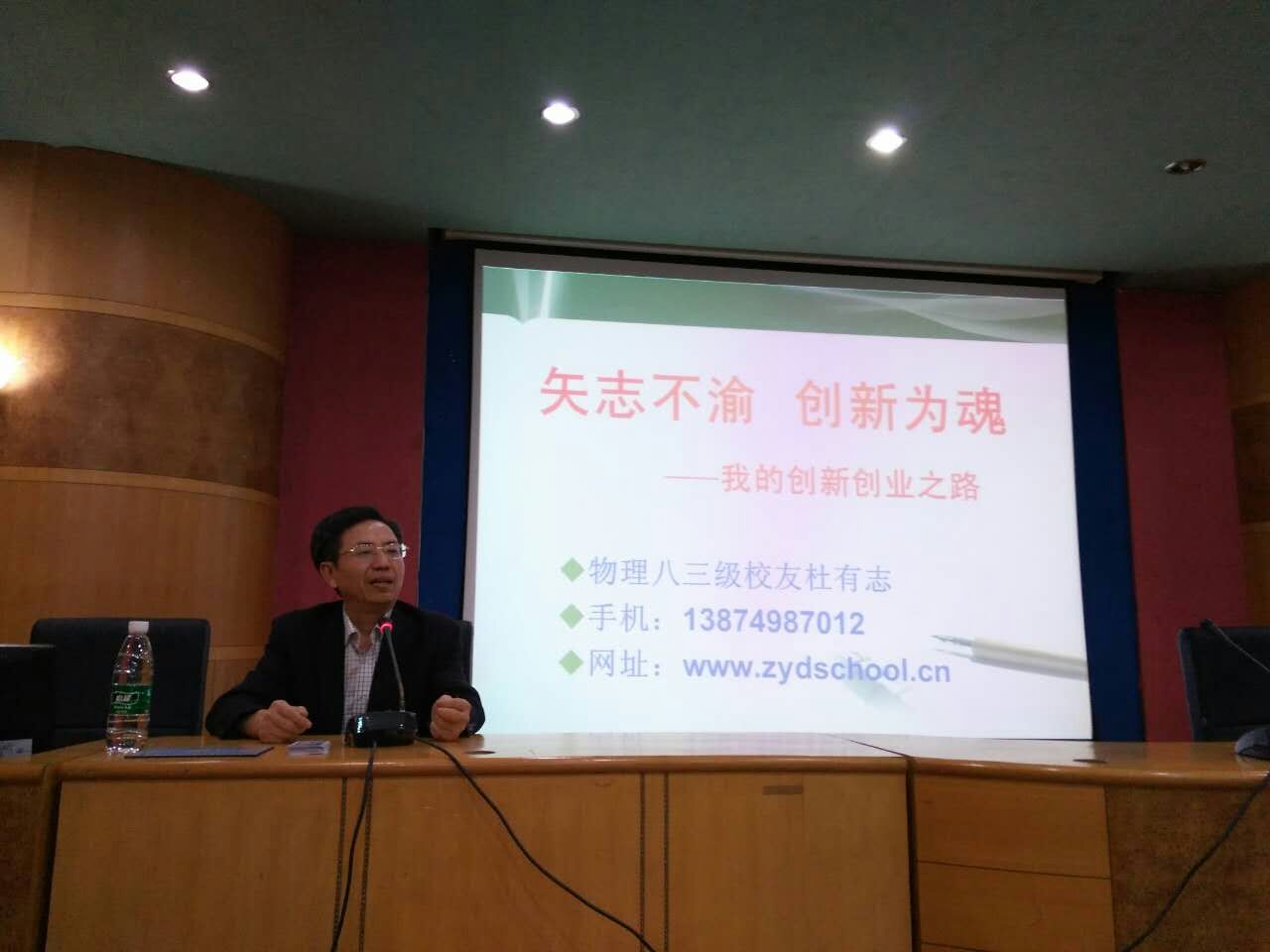 杜有志先生结合自己的成长经历学历,围绕知识创新与知识创业娓娓道来。他说创新创业要有胆识和毅力,他曾尝到过创新创业的甜头,也经历了许多困难,克服困难须有矢志不渝的决心。他说大学生创新创业最好要有知识含金量,打铁还须自身硬。知识的根基越深厚,创业才有底气,知识越创新才有发展实力。他本人是中国第一个记忆研究生,毕业于上世纪90年代初,他发明的“ZYD”记忆法曾经荣获“国际博览会金奖”,当时许多高校要引进他,但被他婉言谢绝。因为他的志趣在创业。研究生毕业后他自己创办记忆研究所,继续从事研究,自己创办记忆学校,从事知识推广与应用。此后,他主持了研究课题《自我教育与学生学习能力的自主发展》获教育部“十五”规划课题立项并通过验收。由于他研究成果的原创性、实用性和推广工作有效性,国内先后有数十万人在他的记忆培训中受益,他自己因此赢得了许许多多的荣誉和好的口碑:他以最高票当选长沙市十大杰出青年;当选当代和谐中国十大杰出人物;2007年至今连续三届当选长沙市人大代表;他的记忆学校也获得了长沙市首届人们满意的十佳学校;湖南省十佳培训学校;中国教育十佳特色学校。