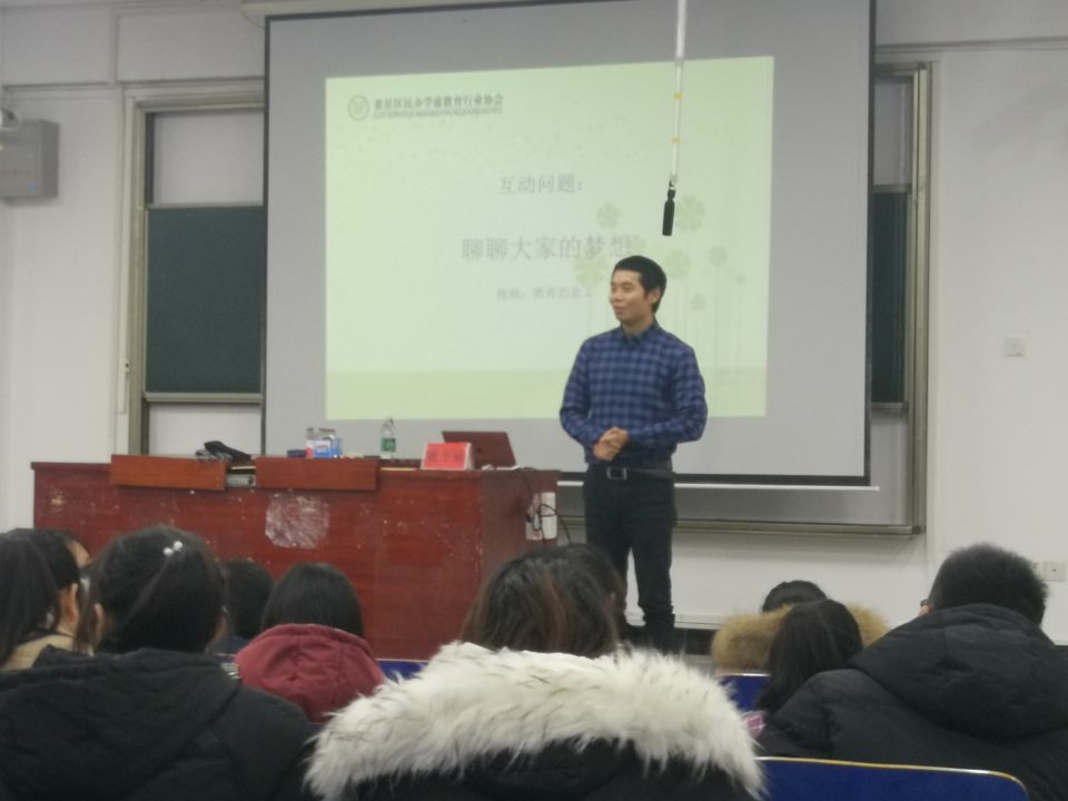 12月24日,创新创业主题讲座二在致远楼219开展,本次讲座主讲人为花圃幼儿园创办人施冬成,17级与18级学前教育专业和人文教育专业全体学生参加。讲座中施冬成强调梦想、专业技能与坚持对创新创业的重要性,呼吁大家要坚持理想,不断开拓自我。