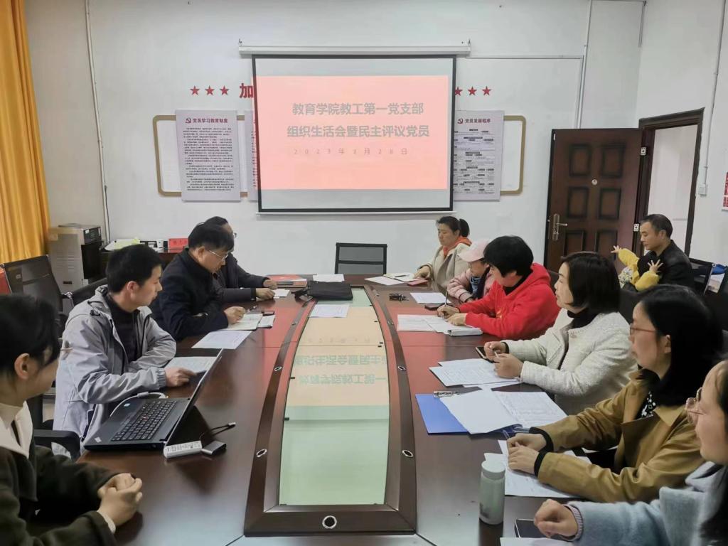 为深入学习贯彻党的二十大精神,坚持不懈用习近平新时代中国特色社会主义思想凝心铸魂,3月28日晚,教育学院教工第一党支部在甘澍楼204党员活动室召开2022年度组织生活会暨民主评议党员,会议由支部书记王旭红主持,党总支书记邹坤以普通党员身份参加。