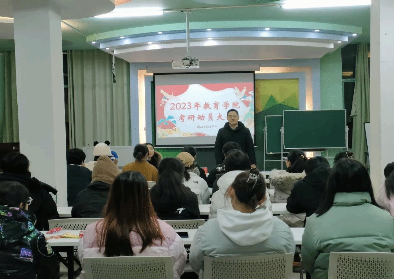 12月17日晚,教育学院在甘澍楼601召开了“2023年教育学院考研动员大会”,党总支副书记田密、副院长刘黎明、辅导员文思婕以及2020级50余名考研学子参加了动员。