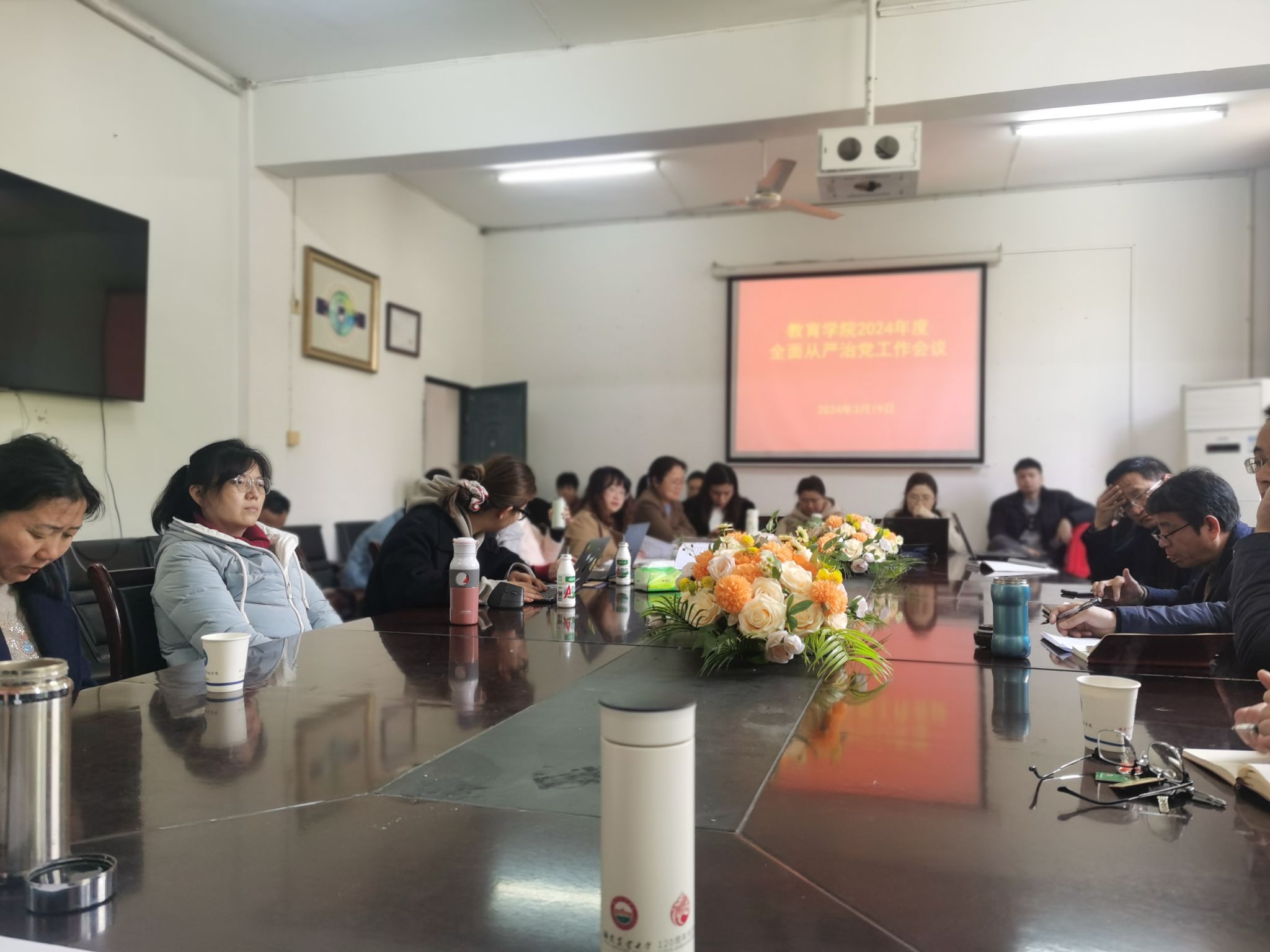 邹坤传达学习全省教育系统全面从严治党视频会议精神和学校全面从严治党工作会议上学校党委书记刘铁铭、纪委书记凌艳平的工作报告。就学院2023年度全面从严治党工作进行总结回顾。在安排部署学院2024年度全面从严治党工作时,他强调,全体教职员工需从“坚定政治站位、忠实履职尽责,抓牢中心工作、维护安全稳定;抓实治党从严、建设清廉学院”三个方面发力,坚定不移推进全面从严治党。他要求,2024年,是实现学校“十四五”规划目标任务的关键一年,是学校办学层次提档升级的关键一年,是教育学院师范专业认证的申报之年,也是学院学风教风建设之年,全体教职员工一定要深刻认识全面从严治党的必要性、紧迫性和长期性,强化全面从严治党永远在路上、党的自我革命永远在路上的思想自觉,切实增强责任感和使命感,为教育学院的高质量发展、高水平安全做出我们教育人的贡献。