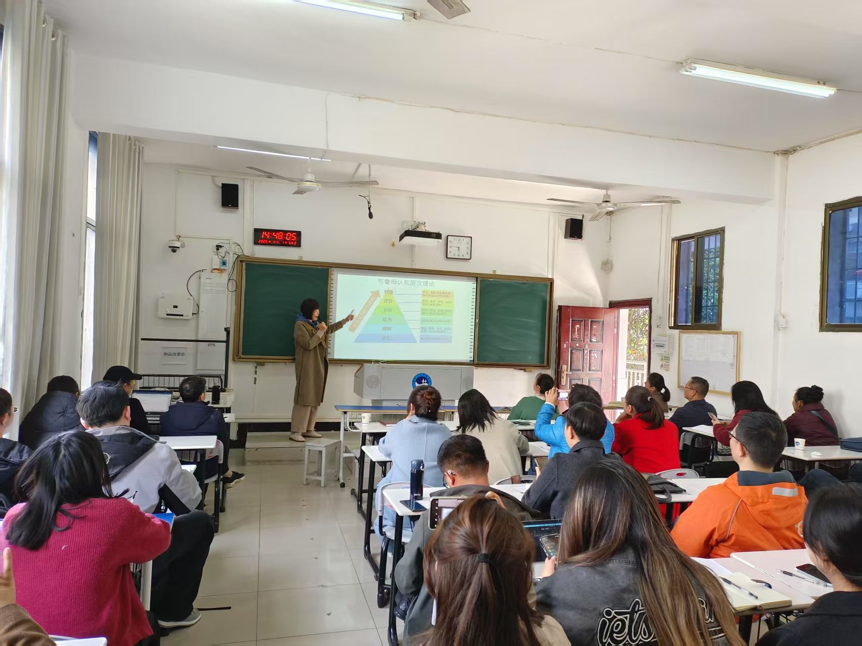 为顺应新质生产力发展、人工智能时代背景下地方应用特色学院培养高素质应用型人才的迫切要求,加大教育教学改革力度,推动各专业深化贯彻OBE理念、提高课堂教学的“两性一度”(高阶性、创新性和挑战度),推动课堂教学的研讨式教学、项目式教学、案例式教学等新形态教学方法的应用,4月1日下午,教育学院在甘澍楼306多媒体教室,举办了一次主题为“AI赋能:挖掘“高阶问题”提升课堂‘两性一度’”专题教研活动。本次活动邀请教育学院资深教师——湖南省优秀教师、院教学督导陈杰副教授主讲。教育学院全体院领导和教职工参加,院长蒋冰清主持了专题教研活动。