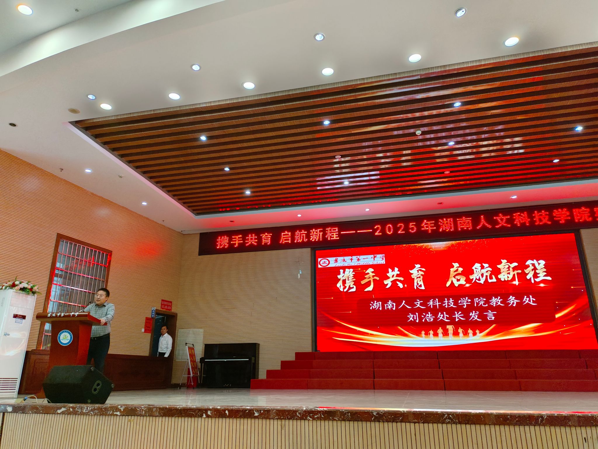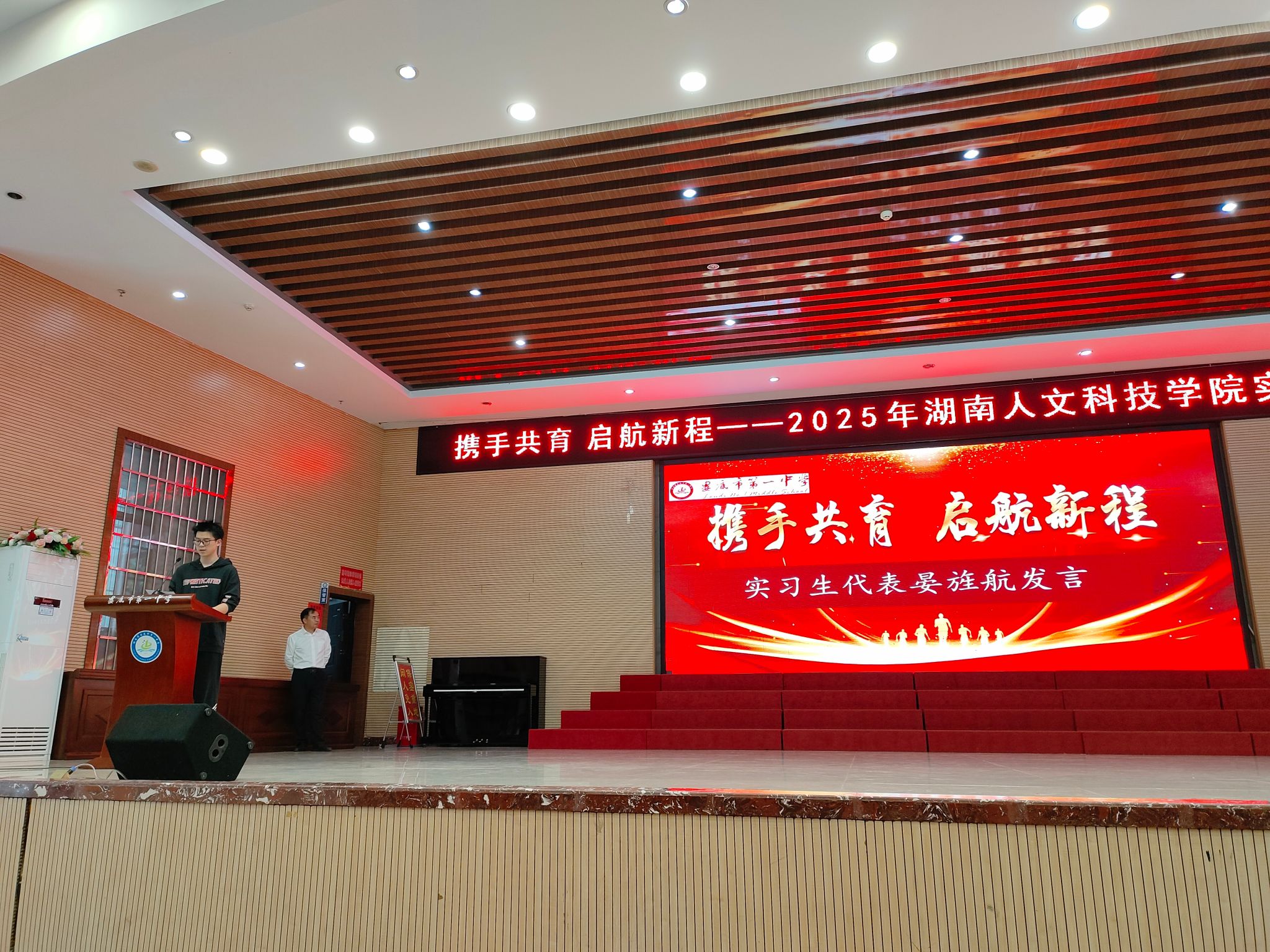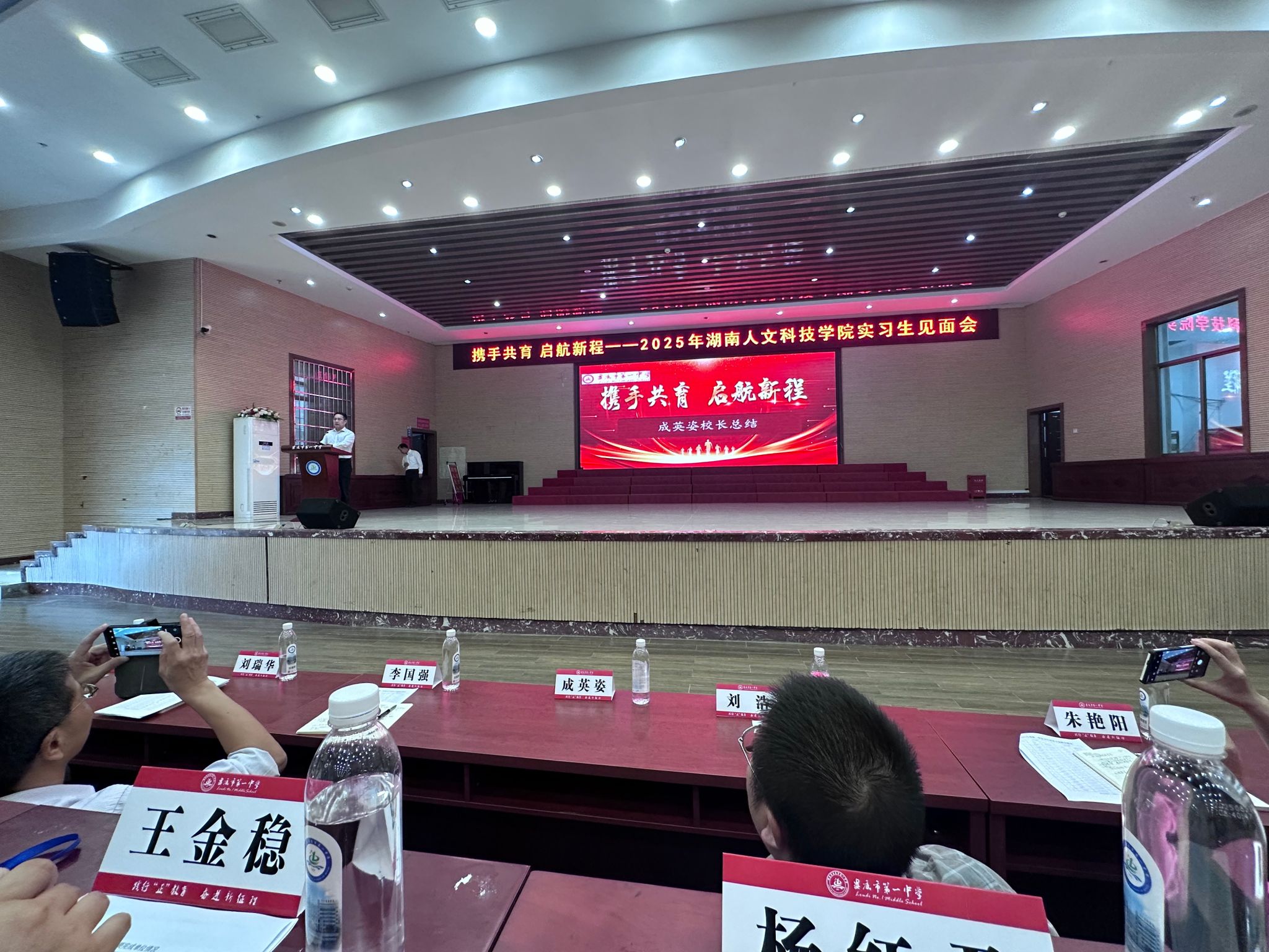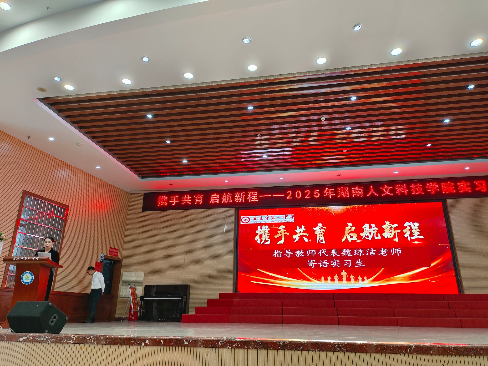 2025年9月22日下午,2025年秋季学期今年会赴娄底一中实习生见面会在娄底一中城南校区隆重举行。娄底一中校长成英姿、副校长刘瑞华等学校领导和相关科室负责人、学校指导老师与会,今年会教务处长刘浩、教育学院副院长李国强、文学院副院长珠艳阳以及来自文学院、体育学院、教育学院、音乐舞蹈学院的实习带队老师和实习生与会。教育学院本次赴娄底一中参加实习队的为应用心理学专业学生,带队教师为邹昭萍、杨红君。