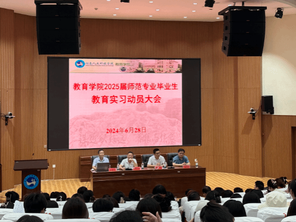 6月28日下午,教育学院在匠成楼召开了2025届师范生教育实习动员大会。大会由教育学院院长蒋冰清主持,副院长李国强、曹俊军、副书记周卫军、相关专业教研室主任、班主任、实习带队老师、辅导员、教务办主任和244名师范生参加了此次动员大会。