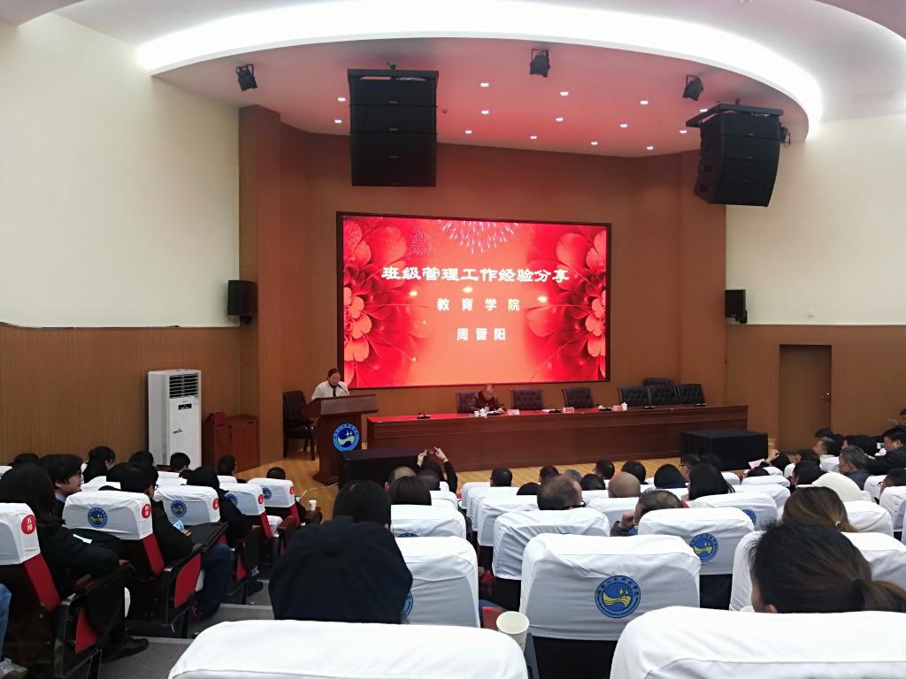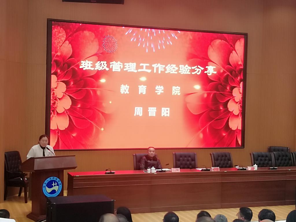 在会上,我院教师周晋阳作为优秀班主任代表做班级管理工作经验典型发言。周老师带过的班级曾被评为学校“优秀班集体”,“全国活力团支部”。她从“发挥专业优势,建立班级的核心理念”、“树立班级整体概念,建立融洽的班级氛围”、“依托班委会,公平处理班级事务”、“关注特殊学生,包容、关爱、鼓励、引导并重”四个方面来分享经验,并通过举实例、讲典型、说做法、话经验,讲述了自己从事班主任工作的心得体会。周老师最后讲述了自己管理班级的情怀:“一个班级就是一团酵母,我尽量用合适的温度,湿度,合适的手法,去激发他们的化学反应。我希望这样的化学反应对他们的整个人生是有建设作用的,是能让他们人格趋向完善的。”