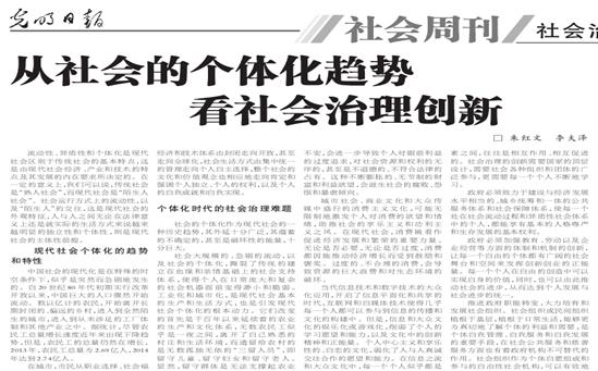 8月24日,今年会中文系李夫泽教授的研究工作《从社会的个体化趋势看社会治理创新》在《光明日报》(社会治理版)发表。该文章是由北京师范大学朱红文教授与李夫泽教授共同完成。